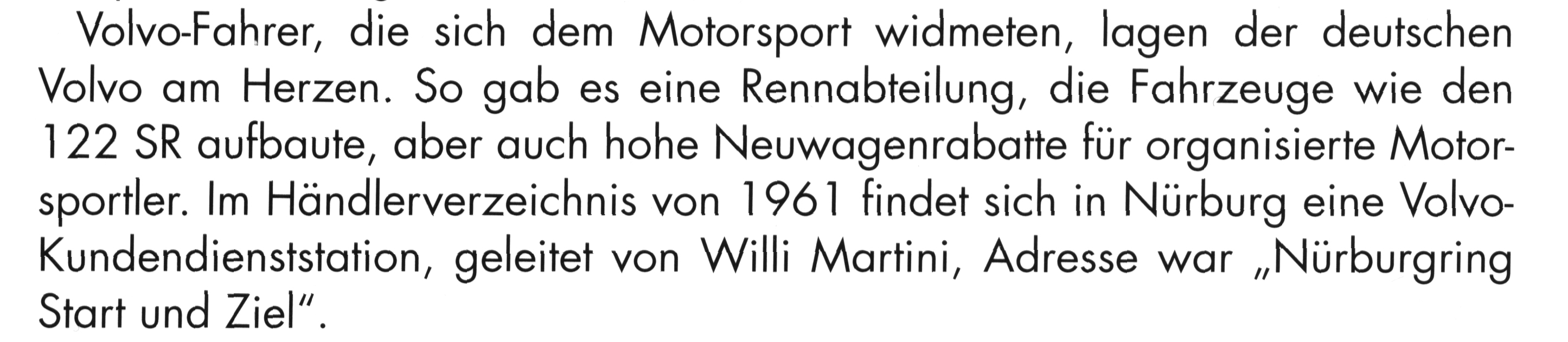 In den Jahren 1960 bis mind. 1966 war Willi Martini am Nürburgring in den BMW Hallen offizieller VOLVO Vertreter.